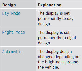 Your COMAND display features optimized designs for operation during daytime and night-time hours. You can customize the design to suit your personal preferences by manually selecting day or night design or opt for an automatic setting.