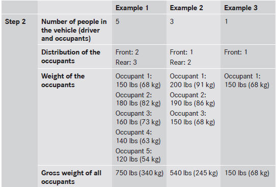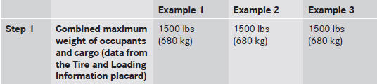 The following table shows examples on how to calculate total and cargo load capacities with varying seating configurations and number and size of occupants. The following examples use a load limit of 1500 lbs. This is for illustration purposes only. Make sure you are using the actual load limit for your vehicle stated on the vehicle’s Tire and Loading Information placard.