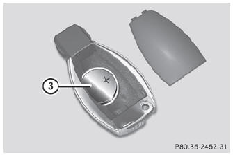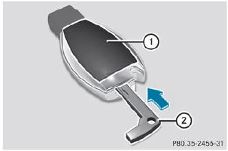 - Press mechanical key 2 into the opening in the SmartKey in the direction of the arrow until battery tray cover 1 opens. When doing so, do not hold cover 1 shut.
