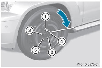 - Tighten the wheel bolts evenly in a crosswise pattern in the sequence indicated (: to A). The tightening torque must be 110 lb-ft (150 Nm).