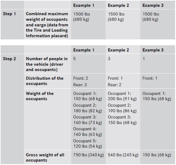 The following table shows examples on how to calculate total and cargo load capacities with varying seating configurations and number and size of occupants. The following examples use a load limit of 1500 lbs. This is for illustration purposes only. Make sure you are using the actual load limit for your vehicle stated on the vehicle’s Tire and Loading Information placard ().